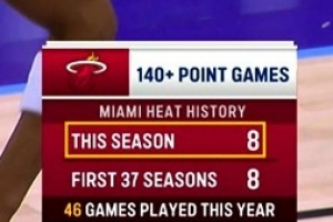 据统计,热火本赛季8次单场140+,而队史此前37个赛季合计8次。