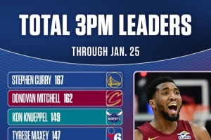 体育资讯1月27日讯 NBC晒出了赛季至今的球员三分命中数排行榜。其中库里排名第一、米切尔第二、克尼佩尔第三。