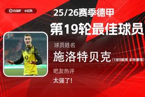 第19轮评选结果出炉,施洛特贝克全场打进1球送出9次解围,攻防两端完美发挥,帮助多特3-0完胜柏林联合,当选【体育资讯X小红书德甲第19轮最佳球员】!