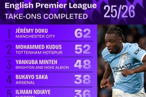 本赛季英超成功过人次数排名: