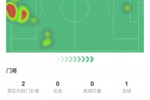 首发踢满全场、扑救4次、禁区内射门扑救2次、击球1次、进球1个
