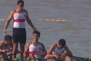 体育资讯11月10日讯 第十五届全国运动会男子四人双桨决赛,来自江苏队的张自毫、臧哈、张汉文、蔡鹏鹏以4:12.24强势夺魁,拿下赛艇项目首枚金牌!