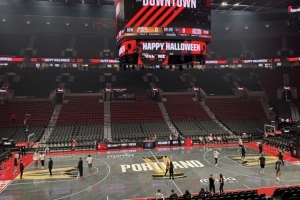 赛前,开拓者跟队中文记者Victor Sun分享开拓者主场地板,并写道:“NBA杯遇上万圣节。”
