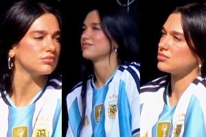 正在阿根廷布宜诺斯艾利斯举行演唱会的啪姐Dua Lipa现场观战博卡青年vs河床的比赛,身着阿根廷最新国家队战袍,并与里克尔梅合影。